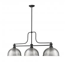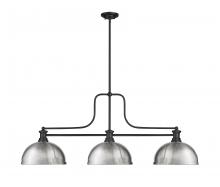 A subtle industrial vibe and brushed nickel and matte black finish pairing flatter this three-light billiards pendant from the M?lange collection by Z-Lite. A simple yet fluid silhouette blends matte black steel and dome-shaped brushed nickel steel shades forming a perfectly balanced profile. This charming fixture is an ideal solution to brighten a kitchen island or sports room billiard space.