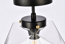 - Features a round canopy and a clear multi-sided glass shade