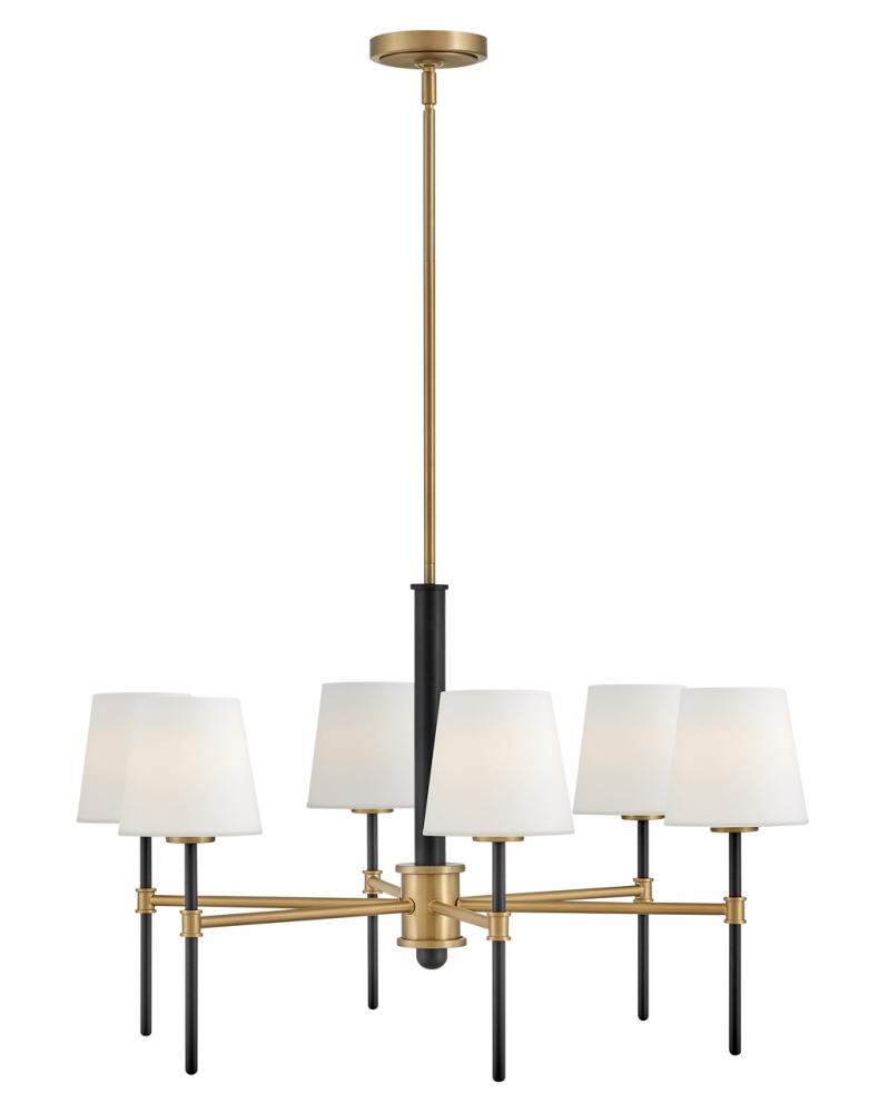 Saunders boasts a striking yet effortless appeal, blending traditional elements with captivating, mid-century modern details. A spoked silhouette and decorative stem holders are finished in Black and Lacquered Brass, paired with blown, etched opal glass shades.