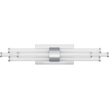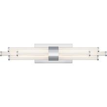 The Talbott bath light features a striking modern design with a sleek, minimalist aesthetic. The rectangular backplate contrasts with the series of parallel cylindrical acrylic rods, creating a unique and eye-catching visual. Each rod houses an integrated