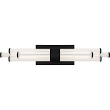 The Talbott bath light features a striking modern design with a sleek, minimalist aesthetic. The rectangular backplate contrasts with the series of parallel cylindrical acrylic rods, creating a unique and eye-catching visual. Each rod houses an integrated