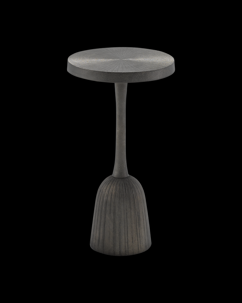 The design of the Tulee Black Accent Table mimics an inverted wine glass. Made of cast aluminum in an antique black finish, the matching circular top of this brown drinks table has been striated to add an extra glint to its exterior when light touches it. This is a weighty metal drinks table given its small size.